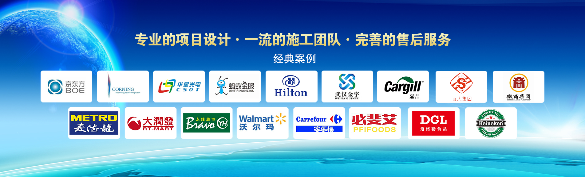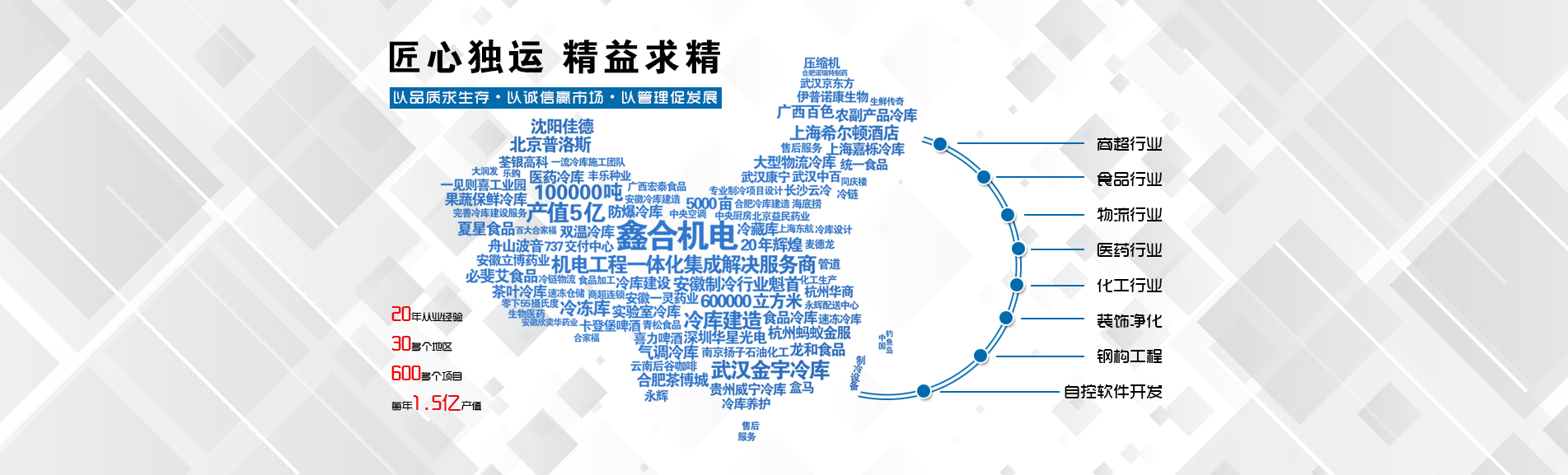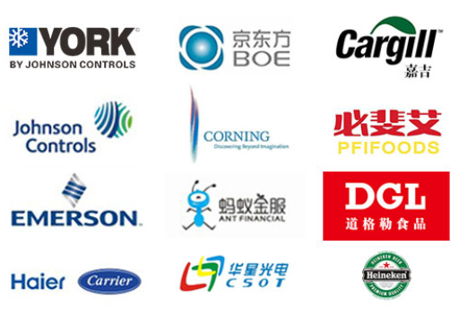 冷凍冷藏設備大型冷庫項目: 武漢中百物流冷庫(40000㎡)、蘇州、北京普洛斯大型物流庫(17000㎡)、沈陽佳德物流冷庫(20000㎡)、上海東航配餐物流庫(6000㎡)、杭州華商勾莊物流冷庫(24000㎡)、安徽安心蔬菜綠色食品冷庫(12000㎡)、武漢金宇冷庫(35000㎡)、必斐艾食品廠(14000㎡)、中國-東盟(百色)農產品交易中心冷庫物流工程(30000㎡)、遵鐵物流冷鏈物流區建設項目中心冷庫物流工程(16500㎡)、長沙云冷產業(yè)園冷庫物流工程(21000㎡)等;大型中央空調項目: 武漢康寧顯示玻璃廠廠房、武漢京東方模組廠房、武漢華星光電模組廠房、深圳華星光電模組廠房,杭州阿里巴巴辦公樓,舟山波音737機場辦公樓,南京江北能源站、上海金融大酒店等